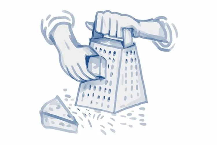 Watercolor style illustration of a hand grating cheese on a handheld cheese grater viewed from front set on isolated white background.