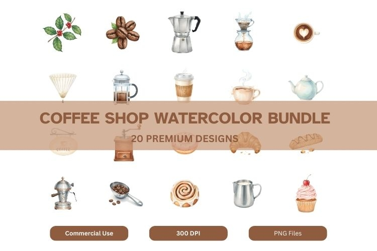 Coffee Shop Watercolor Clipart PNG Bundle - 20 Beautiful Designs