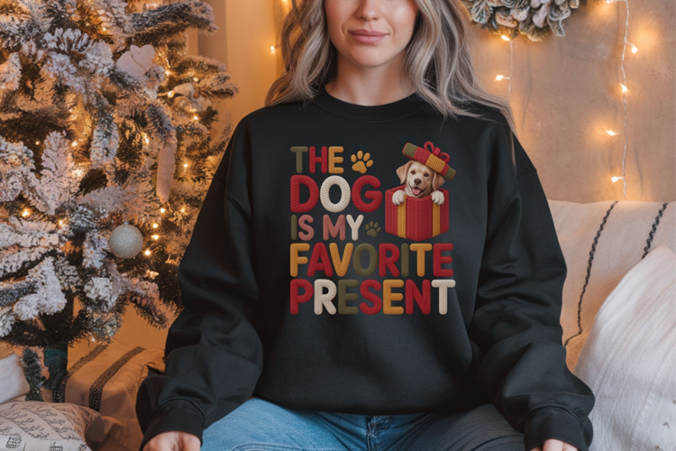 The Mom who loves her dog best! This hilarious Dog is My Favorite Present PNG design uses the popular knitted and chenille embroidery effect to celebrate the love for furry family members during the holidays. The design features the funny quote: "The Dog is My Favorite Present"