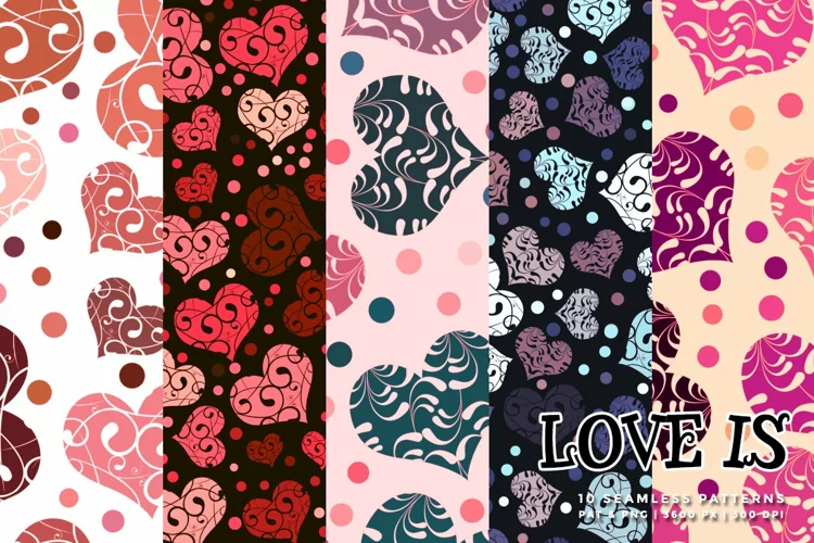 A whimsical, modern set of hearts and dots patterns in a Valentine's day color palette. Great for fabrics, scrapbooking, card making, wrapping paper and bows.