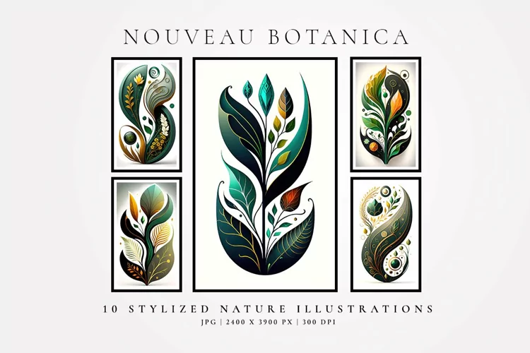 Stylish and elegant set of high resolution botanical illustrations with an Art Nouveau flare, in lavish greens, golden tones and swirly accents. Great for adding a fancy touch as an art print or decorating plates, glasses, mugs, etc.