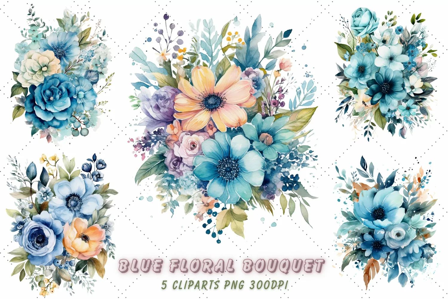 Watercolor Blue Floral Bouquet Clipart Bundle