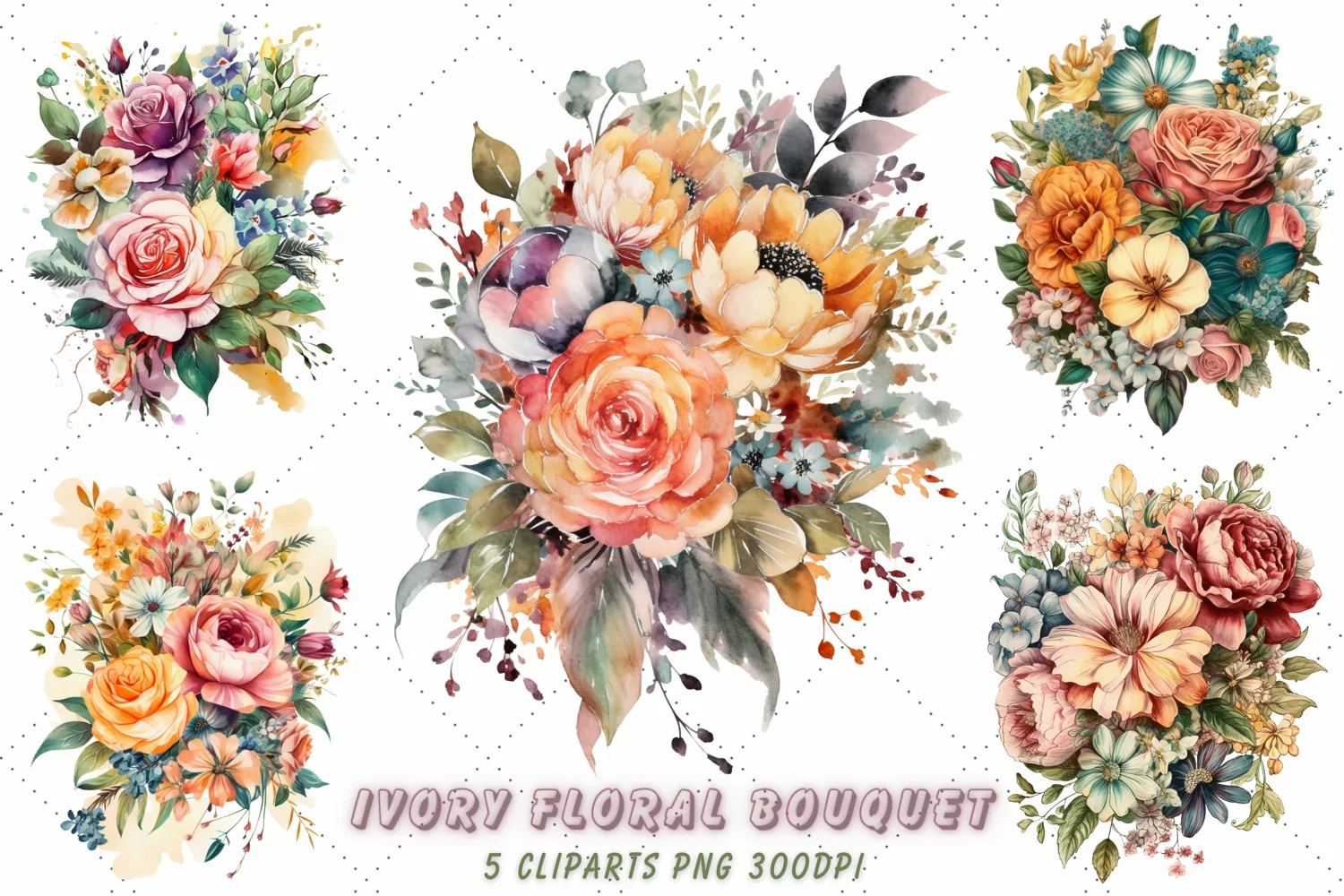 Watercolor Ivory Floral Bouquet Clipart Bundle