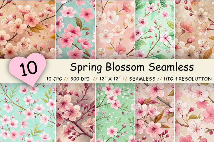 Flowers Premium Digital Papers : Spring Blossom Seamless Pattern, Cherry Blossom Pink and White