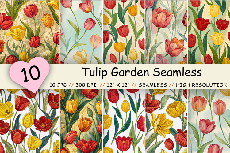 Flowers Premium Digital Papers : Tulip Garden Seamless Pattern, Bright Reds and Yellows