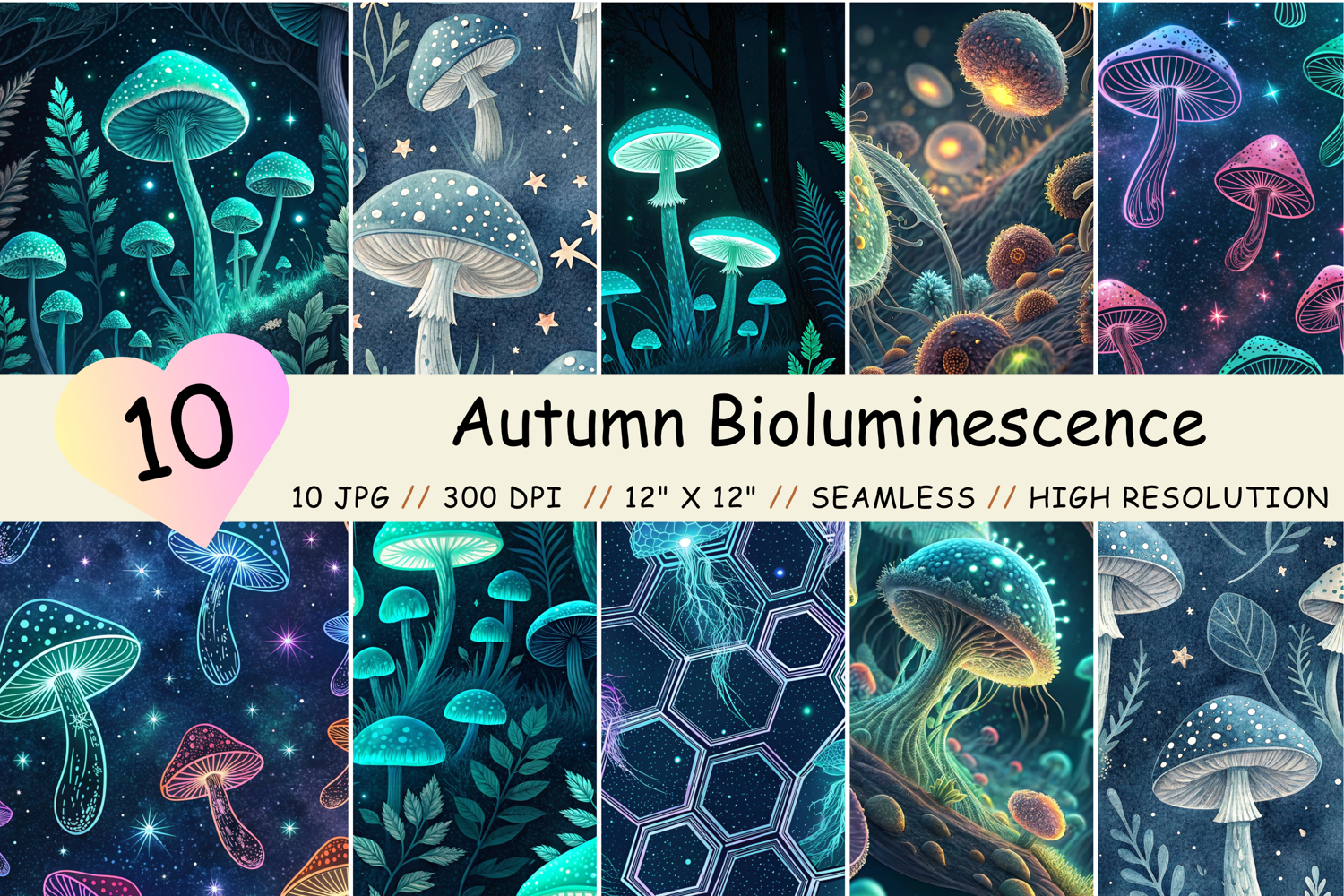 autumn bioluminescence seamless, glowing mushroom pattern, magical forest night, luminous fungi design, ethereal glow background, dark woodland paper, foxfire forest art, neon nature pattern, enchanted wood design, sci-fi flora paper