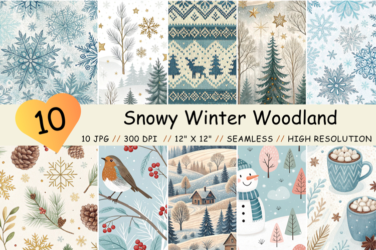 Flowers Premium Digital Papers : Snowy Winter Woodland Digital Paper, Cozy Snowflake and Forest Pattern Set