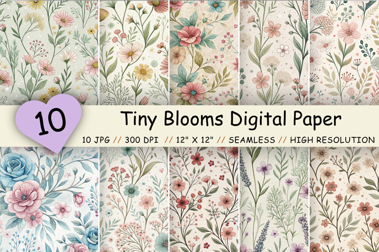 Flowers Premium Digital Papers : Tiny Blooms Seamless Digital Paper Pack, Pastel Ditsy Floral Printable Backgrounds