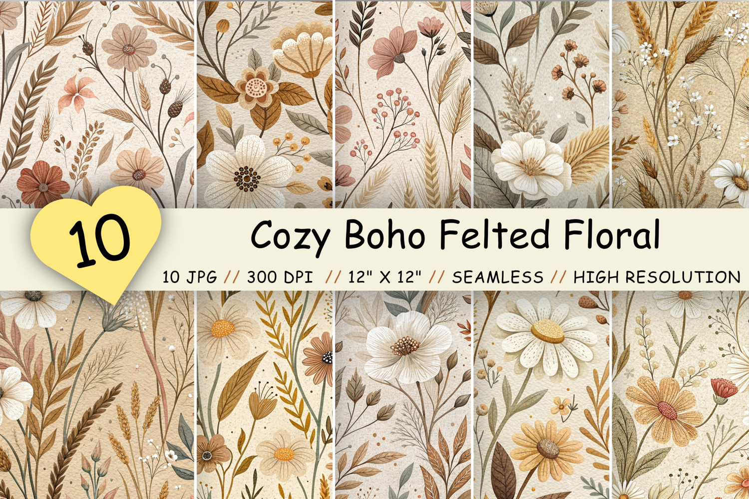 Cozy Boho Felted Floral Seamless Pattern Bundle, Neutral