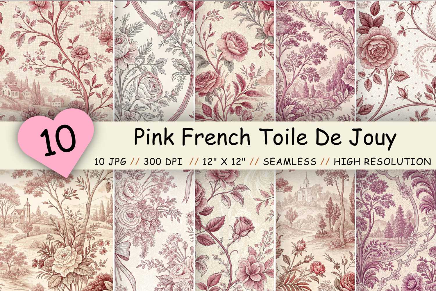 French Toile Design Pink French Toile De Jouy Seamless Pattern Bundle Vintage Floral Damask Digital Paper Romantic Cottage Fabric Design Pink Toile Pattern Toile De Jouy Pink Vintage Floral Toile Romantic Toile Pattern Seamless Toile Paper Cottagecore Toile
