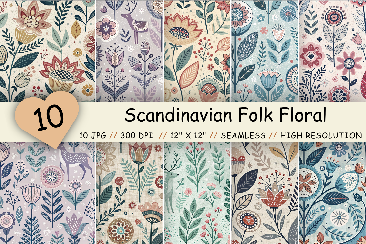 Flowers Premium Digital Papers :Scandinavian Folk Floral Seamless Patterns Bundle, Nordic Pastel Folk Art Digital Paper