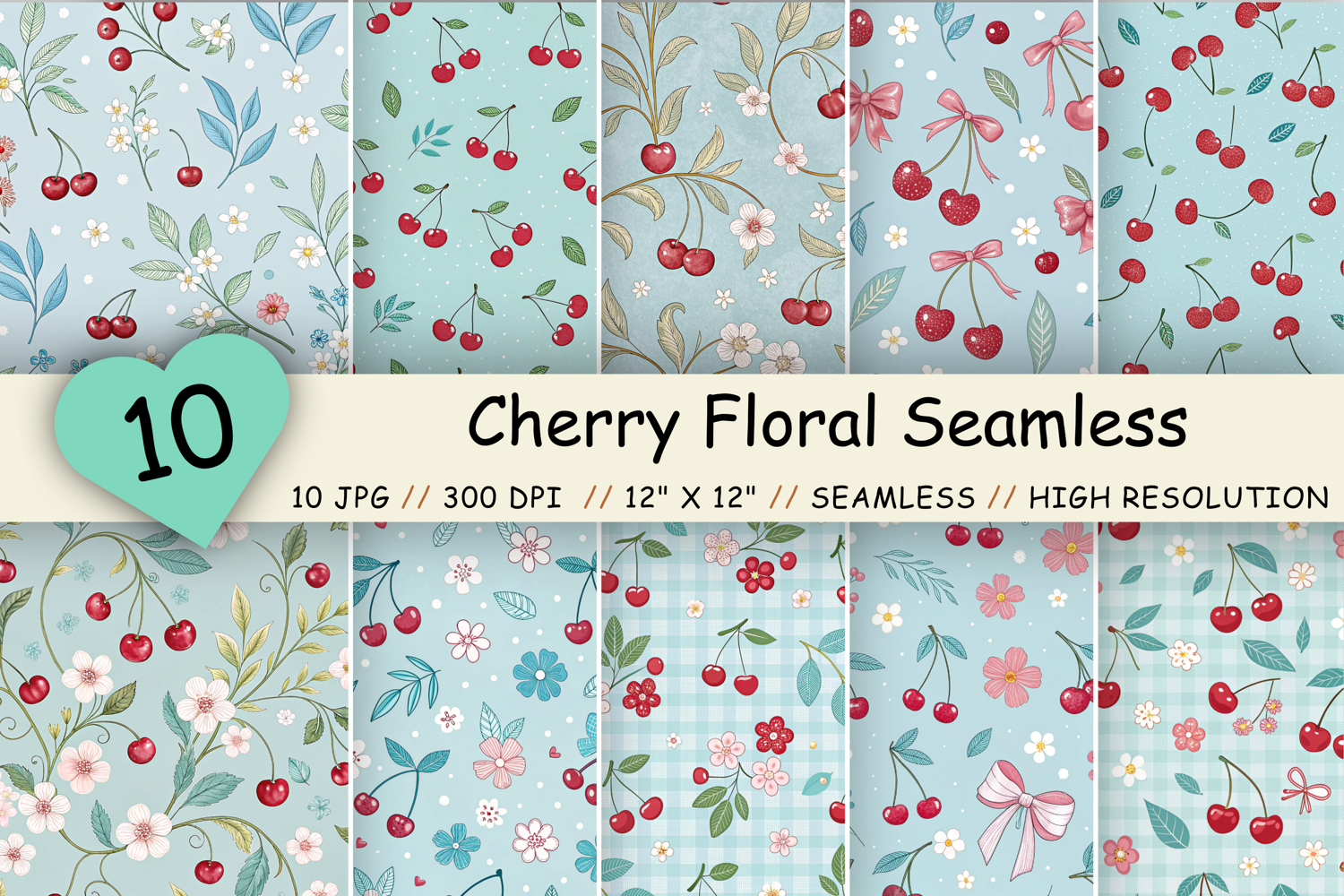 Cherry Digital Paper Cute Cherry Pattern Cherry Seamless Pattern Cherry Floral Pattern Cherry Floral Seamless Pattern Bundle Blue Gingham Cherry Digital Paper Pack Cute Coquette Fabric Design Cherry Fabric Pattern Cherry Repeat Pattern Cherry Floral Paper