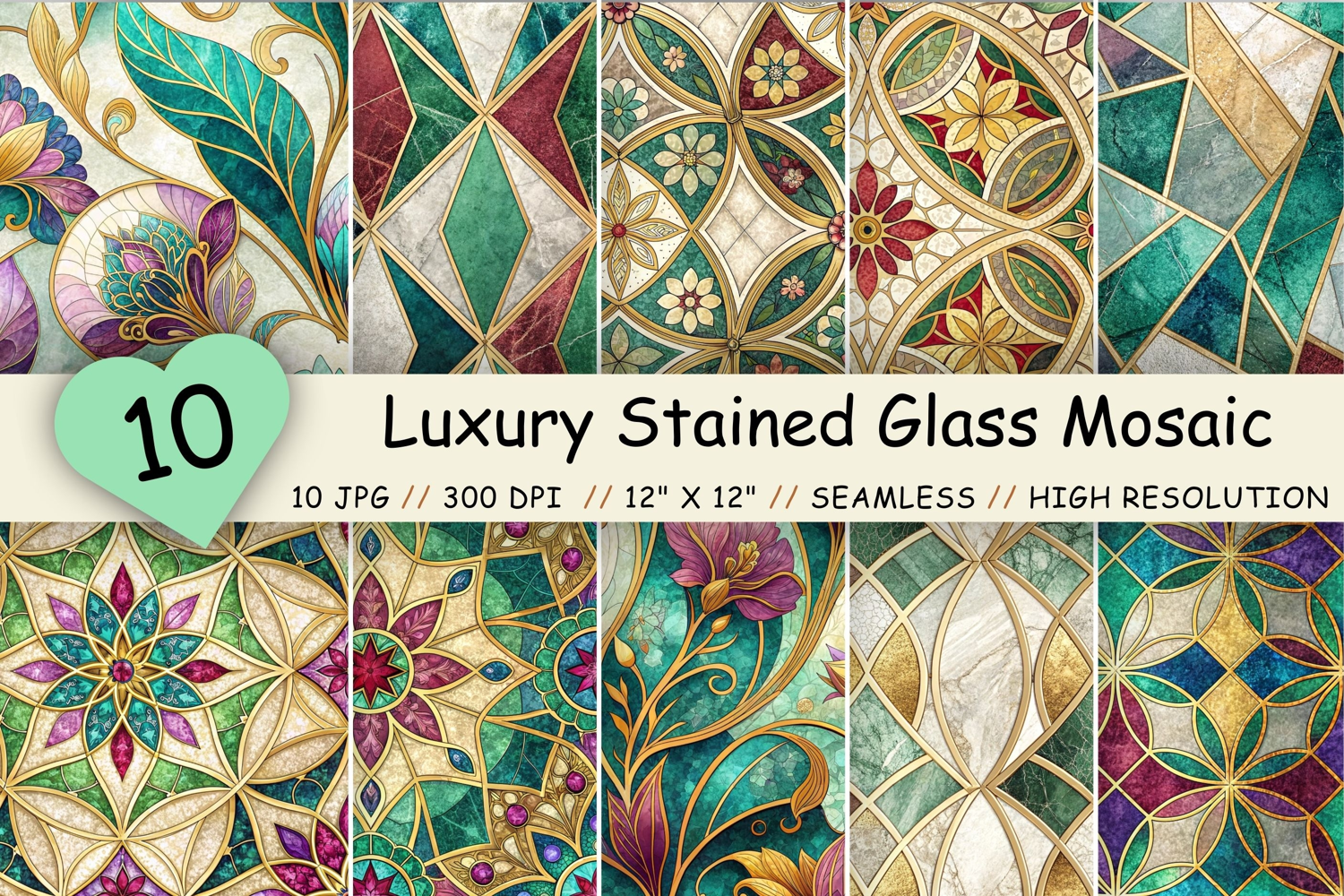 Flowers Premium Digital Papers : Luxury Stained Glass Mosaic Seamless Patterns, Gold Foil Geometric Digital Paper, Jewel Tone Ornamental Background, Premium Printable Texture Pack