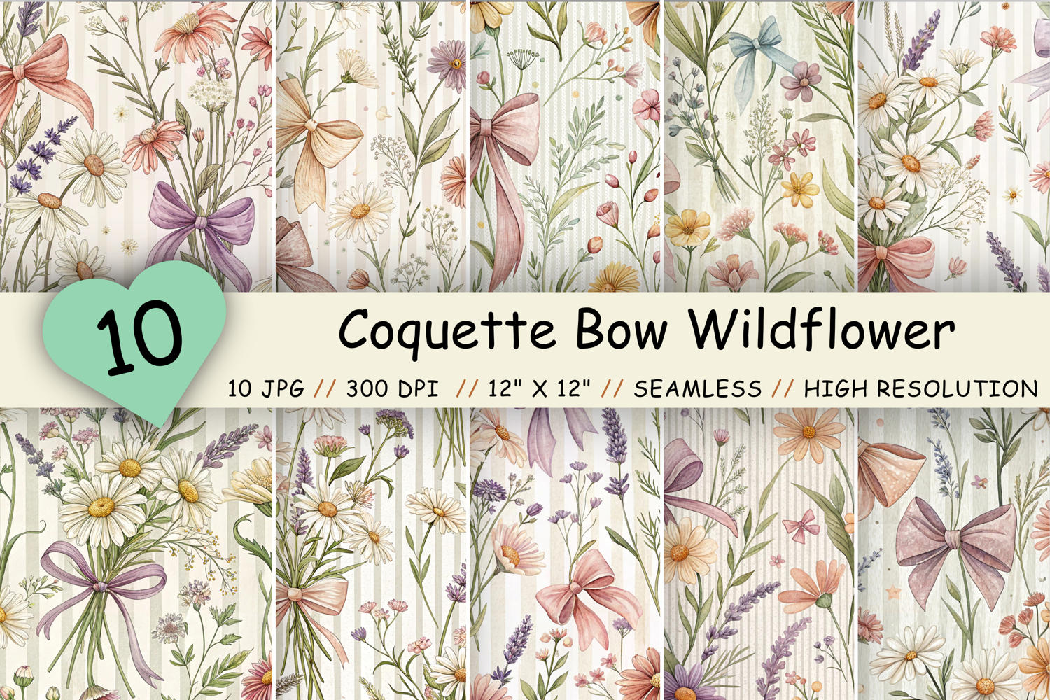 Coquette Bow Wildflower Digital Paper, Pastel Cottagecore