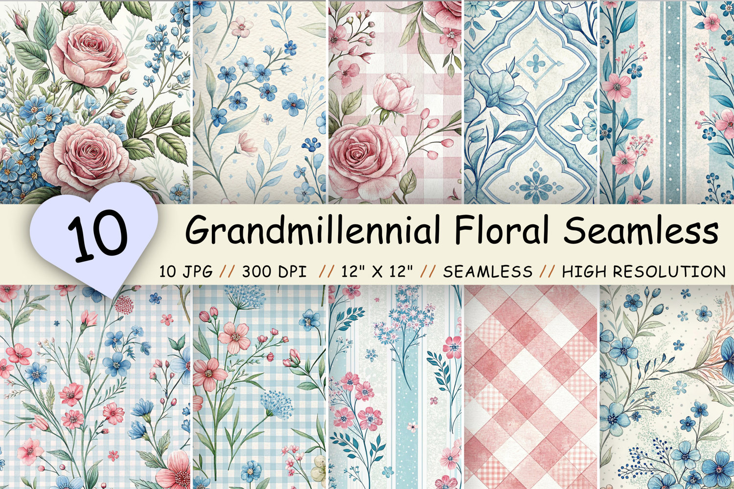 Flowers Premium Digital Papers : Grandmillennial Floral Seamless Digital Paper, Vintage Pink Blue Floral Patterns, Gingham Stripes Cottagecore Scrapbook Paper
