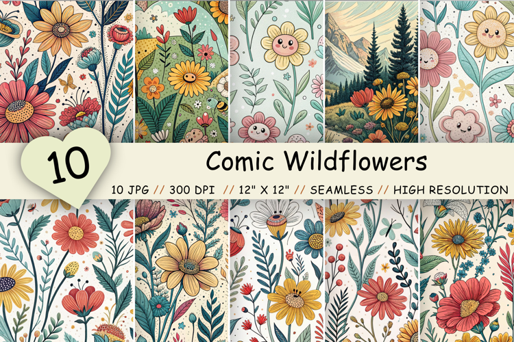 Comic Wildflowers Seamless Digital Paper, Cute Cartoon