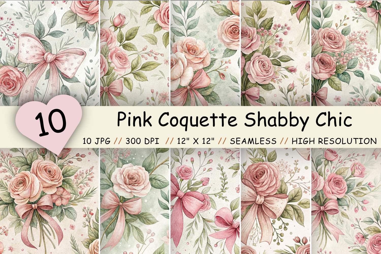Flowers Premium Digital Papers : Pink Coquette Shabby Chic Seamless Patterns, Vintage Rose & Bow Pastel Floral Digital Paper, Fabric & Cottagecore Designs