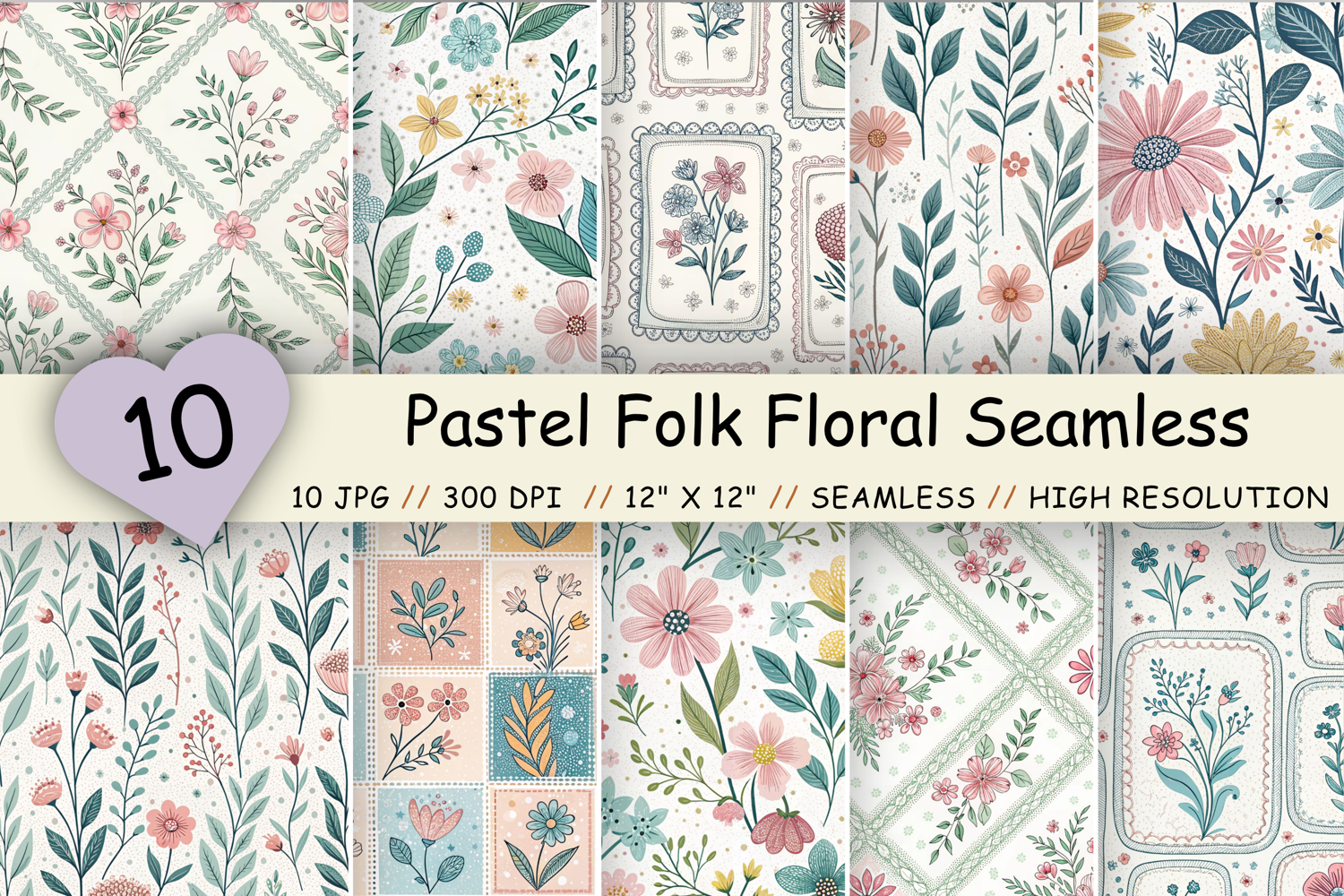 Flowers Premium Digital Papers : Pastel Folk Floral Seamless Pattern, Cottagecore Pattern Bundle
