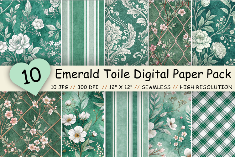 Flowers Premium Digital Papers : Emerald Toile Digital Paper Pack, Vintage Floral Toile, Gingham & Stripe Seamless Patterns, Wedding, Scrapbooking & Printable Crafts