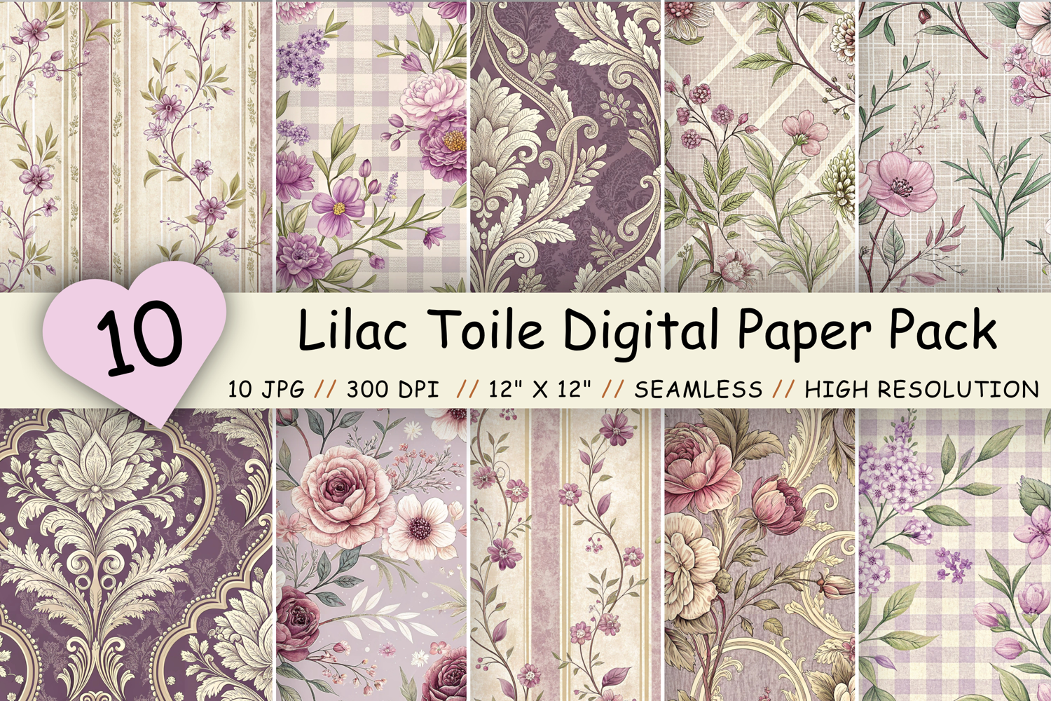 Flowers Premium Digital Papers : Lilac Toile Digital Paper Pack, Vintage Floral Toile, Gingham & Stripe Seamless Patterns, Wedding, Scrapbooking & Printable Crafts