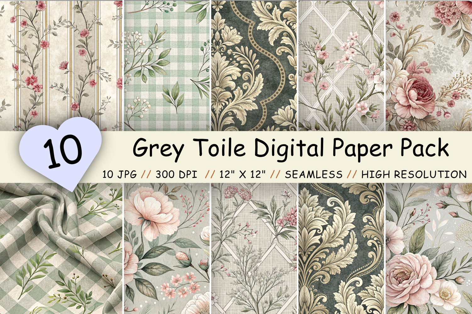 Flowers Premium Digital Papers : Grey Toile Digital Paper Pack, Vintage Floral Toile, Gingham & Stripe Seamless Patterns, Wedding, Scrapbooking & Printable Crafts