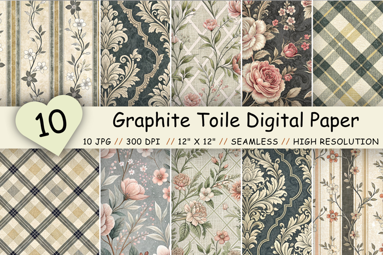 Flowers Premium Digital Papers : Graphite Toile Digital Paper Pack, Vintage Floral Toile, Gingham & Stripe Seamless Patterns, Wedding, Scrapbooking & Printable Crafts