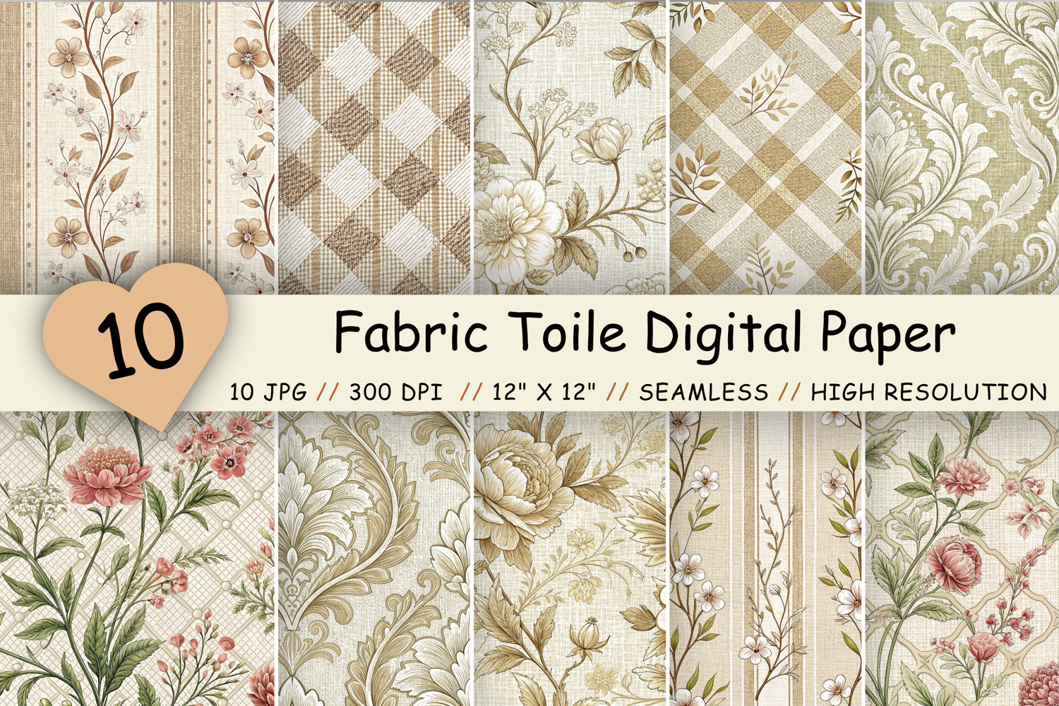 Flowers Premium Digital Papers : Fabric Toile Digital Paper Pack, Vintage Floral Toile, Gingham & Stripe Seamless Patterns, Wedding, Scrapbooking & Printable Crafts