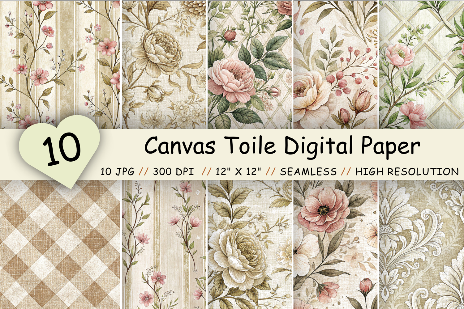 Flowers Premium Digital Papers : Canvas Toile Digital Paper Pack, Vintage Floral Toile, Gingham & Stripe Seamless Patterns, Wedding, Scrapbooking & Printable Crafts
