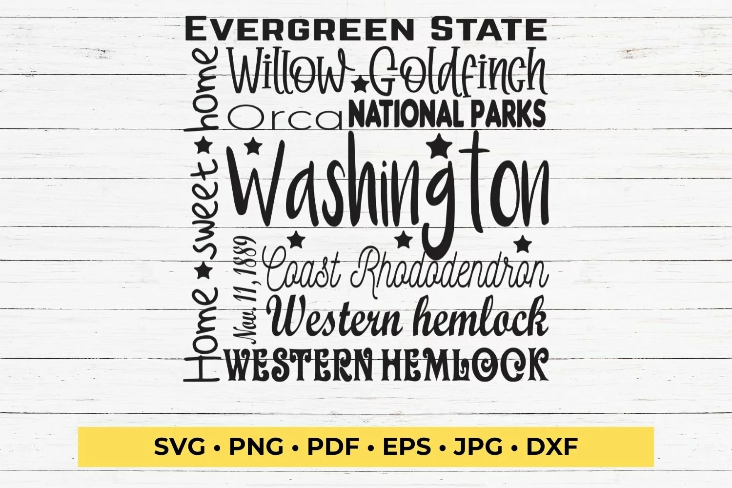Use this State of Washington square typography design with representative words to create gift items. The PNG file can be sublimated, and the SVG file can be cut out with Cricut or Silhouette Cameo.