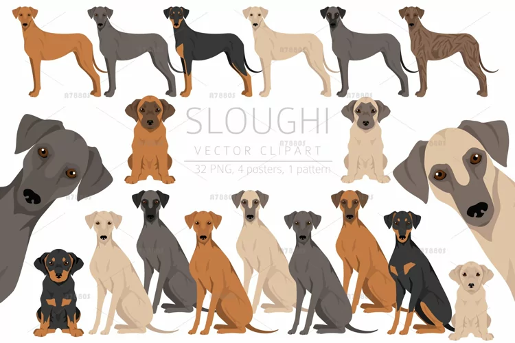 There are vector graphic dog cliparts, all coat colors, some poses design