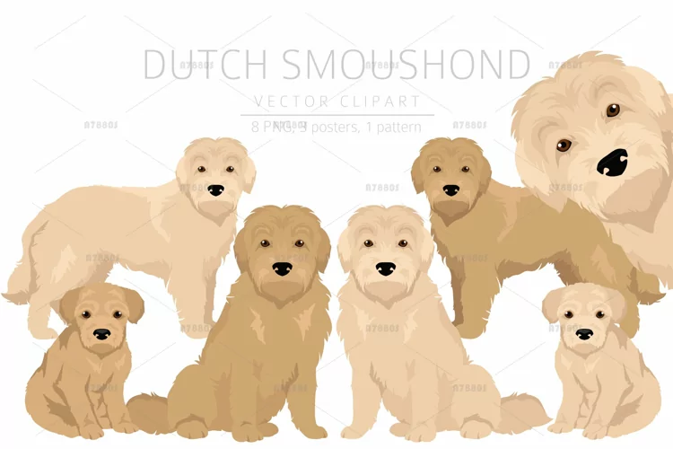 There are vector graphic dog cliparts, all coat colors, some poses design