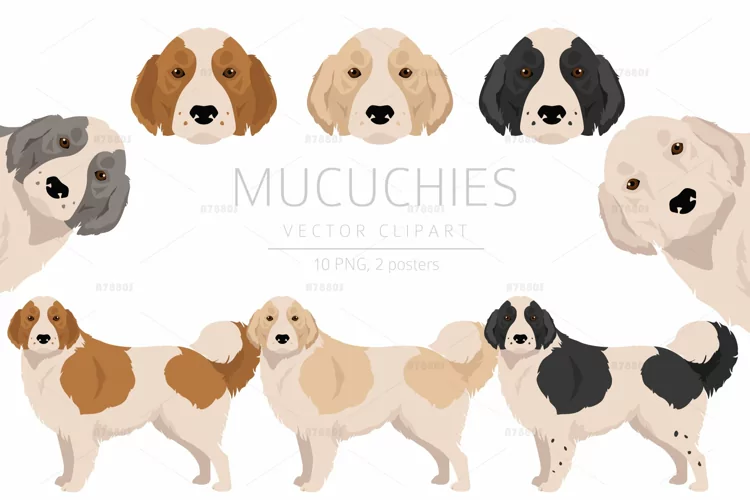 There are vector graphic dog cliparts, all coat colors, some poses design