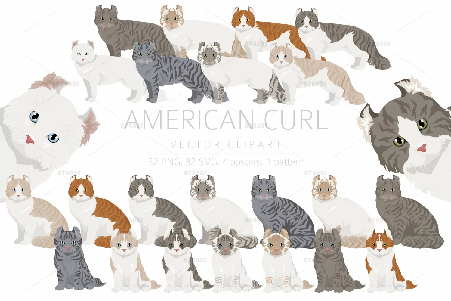 There are vector graphic cat cliparts, all coat colors, some poses design