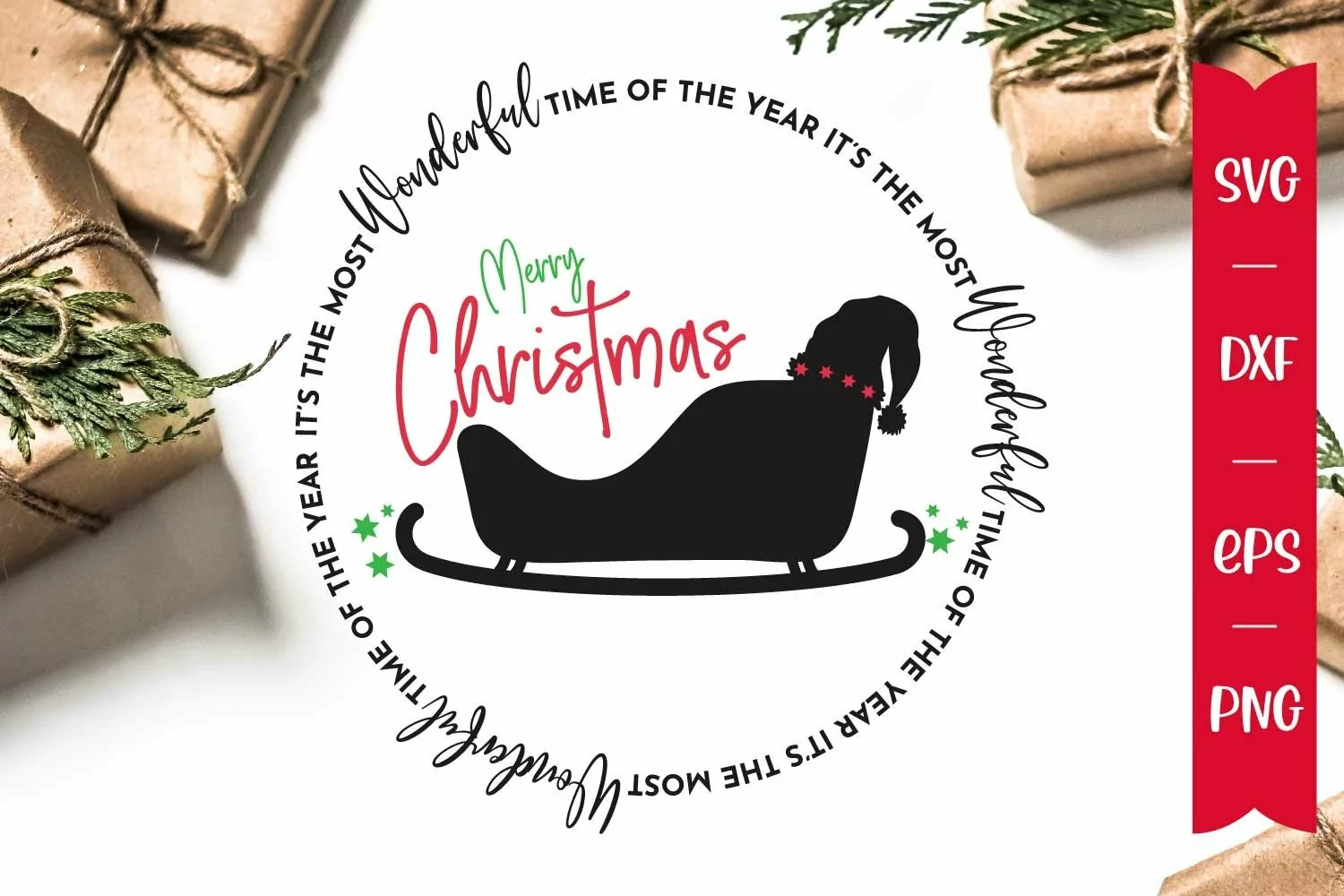 It's the most wonderful time of the year round sign with merry christmas santa sleigh in the midle