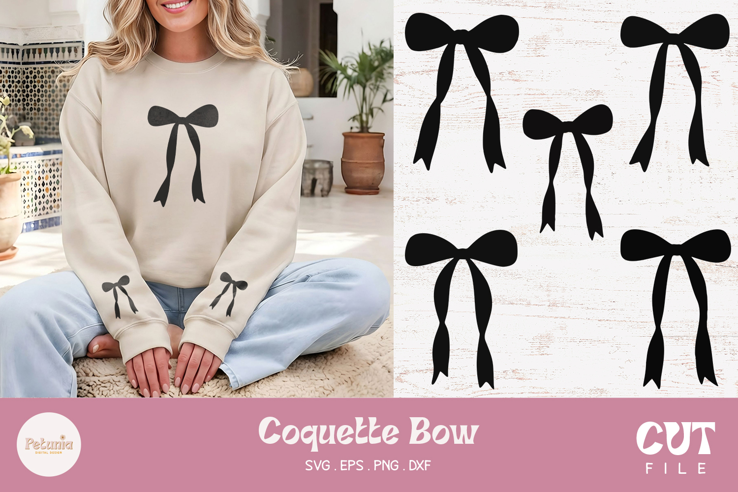 Ribbon coquette bow svg cut file designs being used as trendy coquette t-shirts print