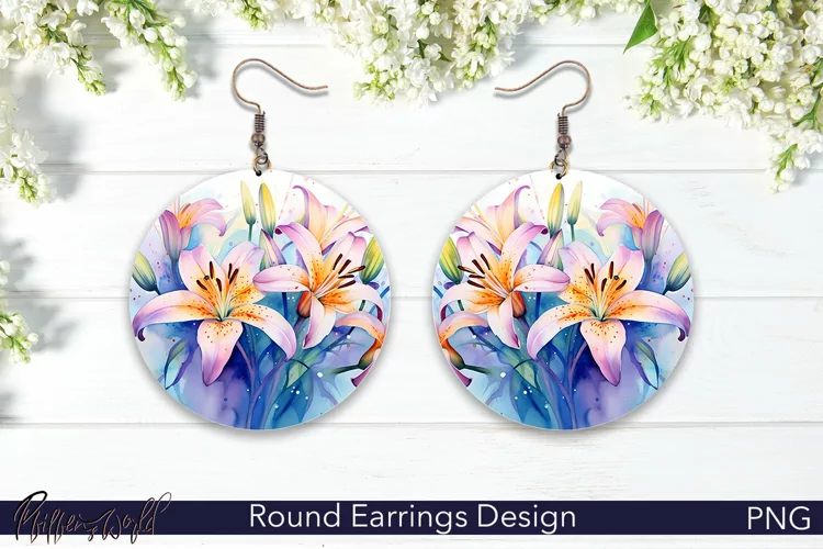 Round Earrings | Design with Lillies Flowers | Colorful PNG