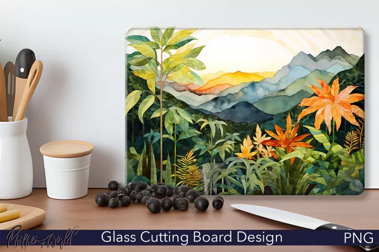 Glass Cutting Board Design | Watercolor Mountains