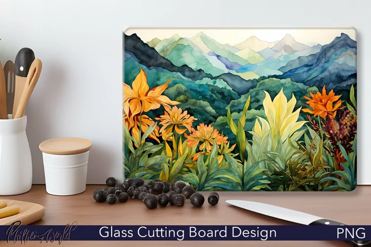 Glass Cutting Board Design | Watercolor Mountains | Tropical