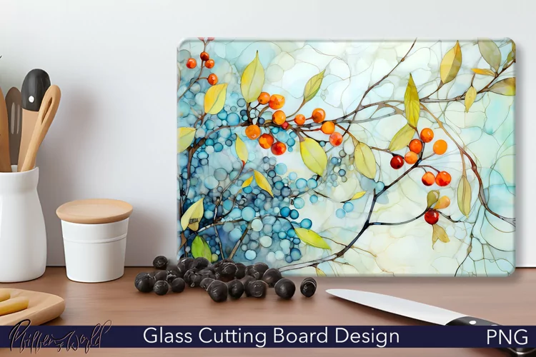 Glass Cutting Board Design | Watercolor Leaves | Blue