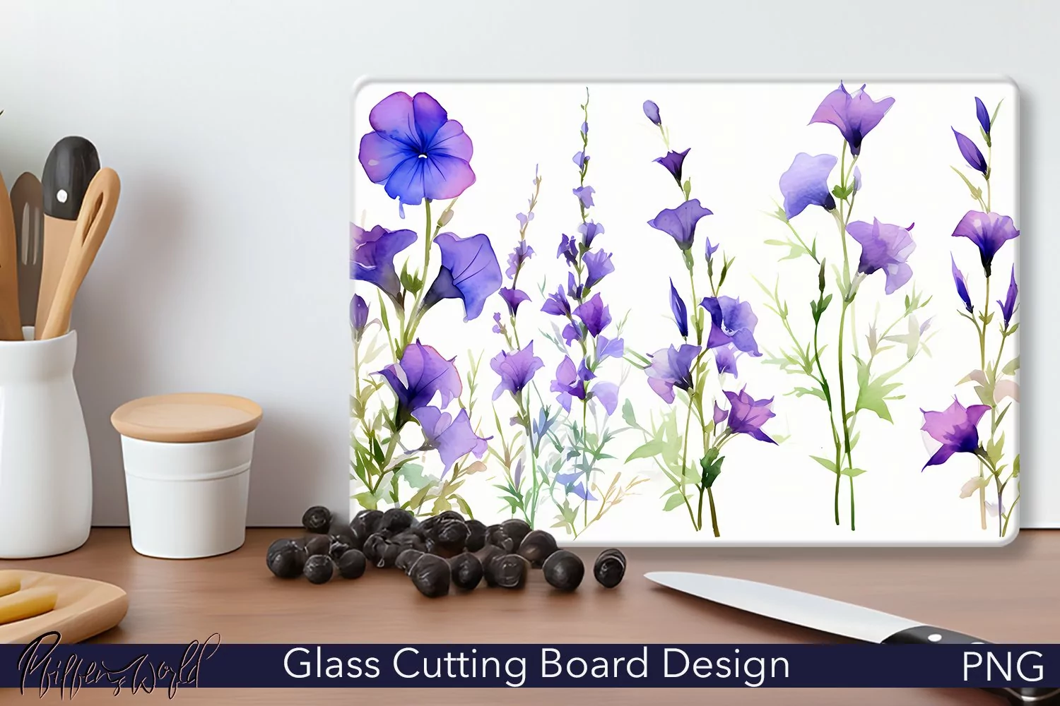 Glass Cutting Board Design | Watercolor Flowers | Bellflower