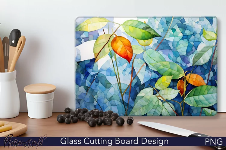 Glass Cutting Board Design | Watercolor Leaves | Blue