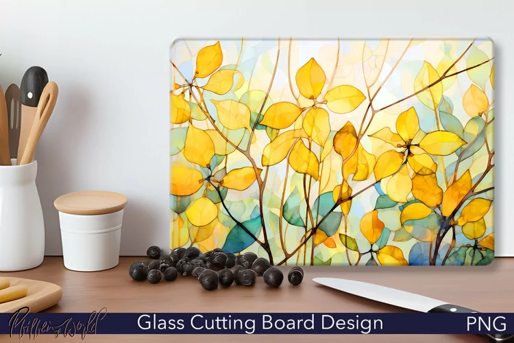 Glass Cutting Board Design | Watercolor Leaves | Yellow