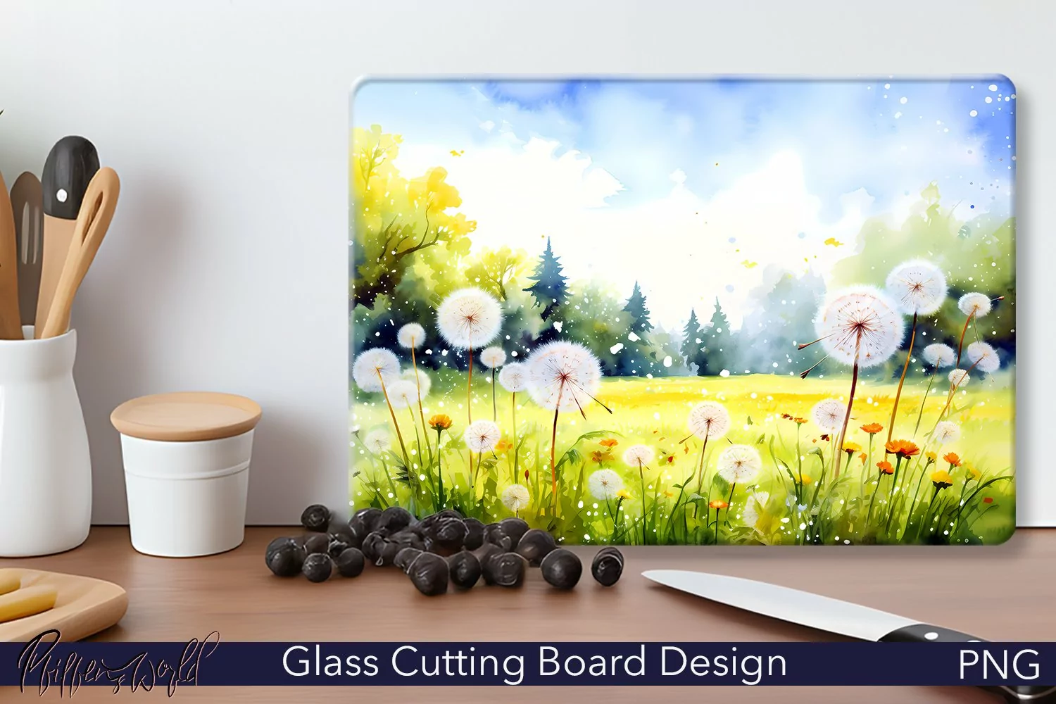 Glass Cutting Board Design | Watercolor Dandelions