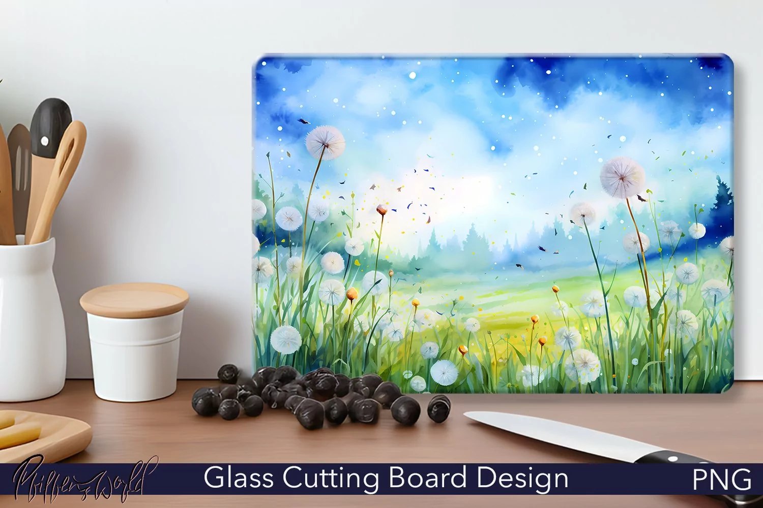 Glass Cutting Board Design | Watercolor | Dandelions