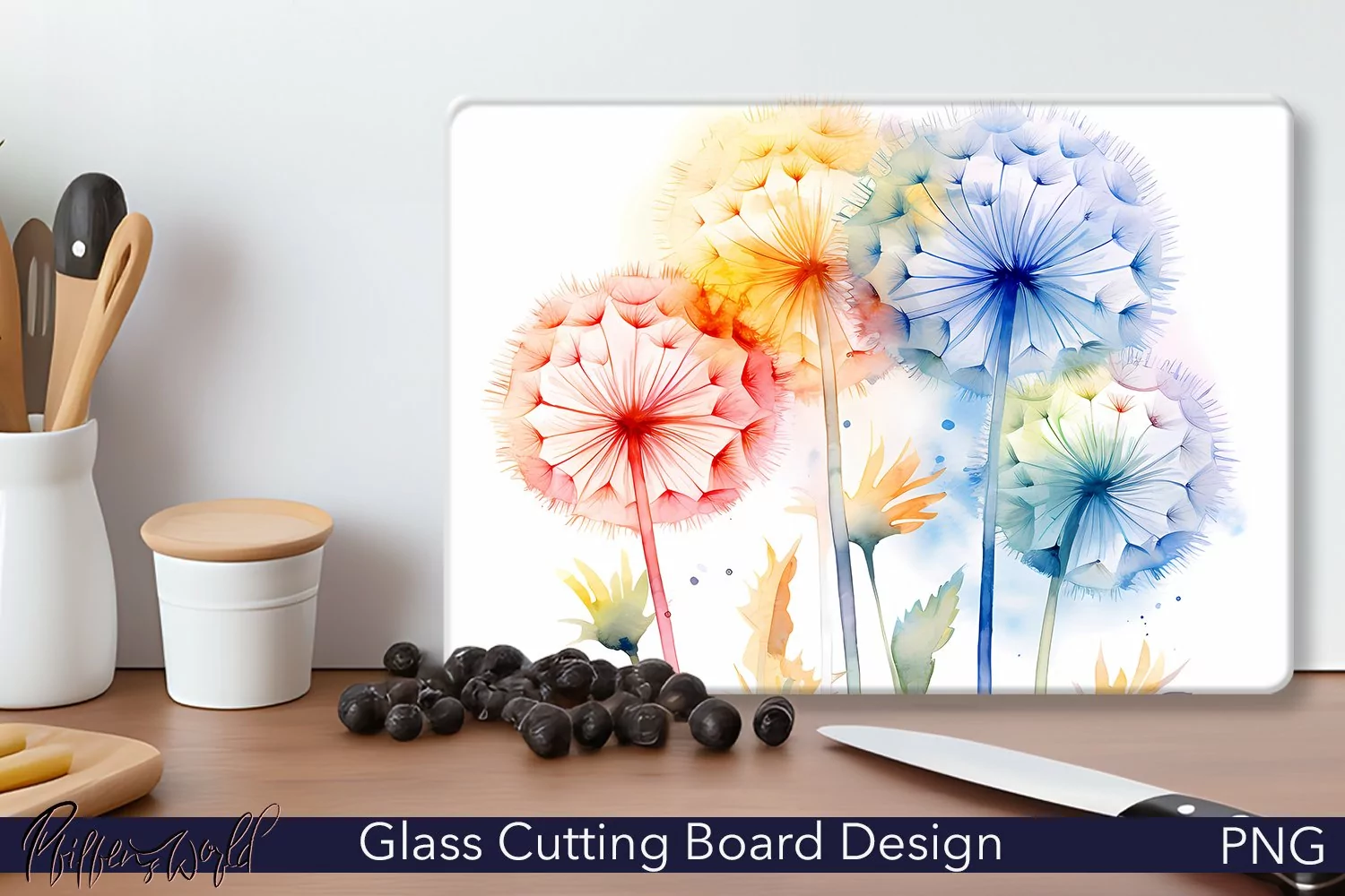 Glass Cutting Board Design | Watercolor | Dandelions Design