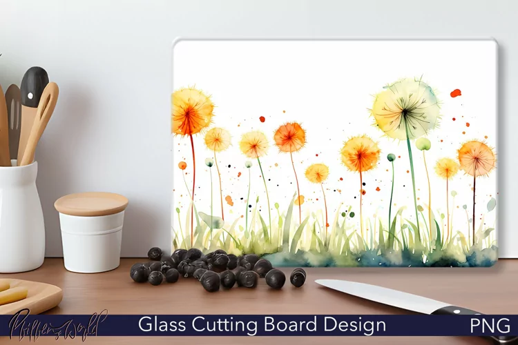 Glass Cutting Board Design | Watercolor | Spring Dandelions