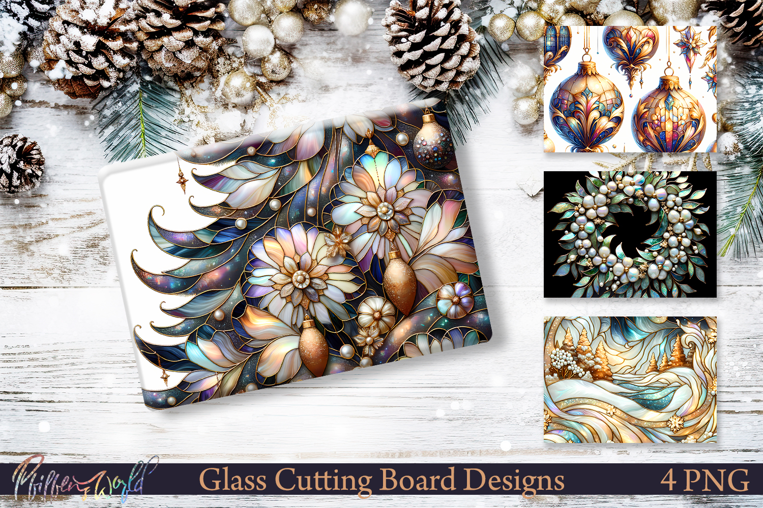 Elevate your holiday kitchen and home decor with this elegant Glass Cutting Board Design Set inspired by stained glass artistry and festive winter florals.