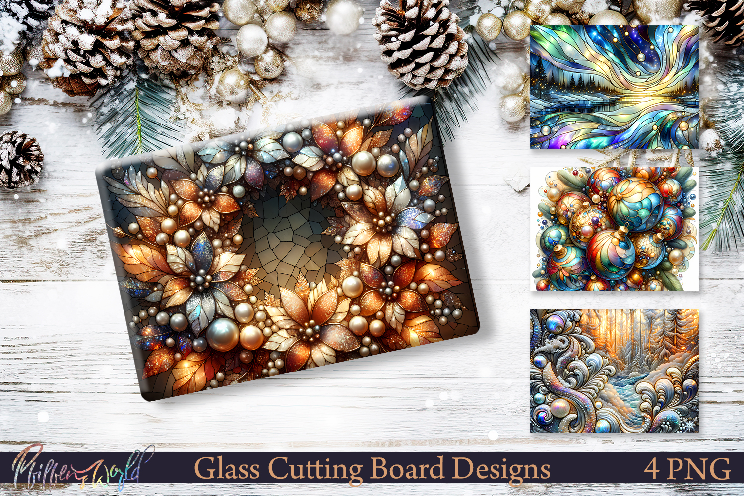 Elevate your holiday kitchen and home decor with this elegant Glass Cutting Board Design Set inspired by stained glass artistry and festive winter florals.