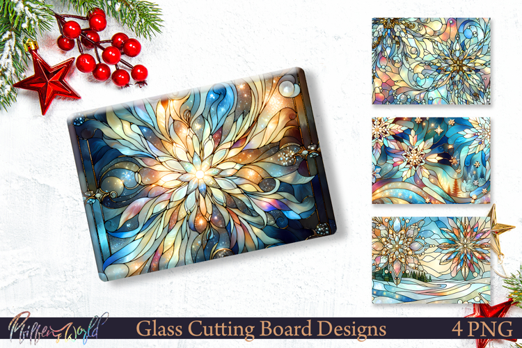 Add a touch of winter magic to your kitchen with this Stained Glass Snowflake Glass Cutting Board Design Set. The collection features ornate snowflake mandalas in icy blues, warm gold accents, and shimmering stained-glass details—perfect for elegant seasonal decor and winter-themed products.