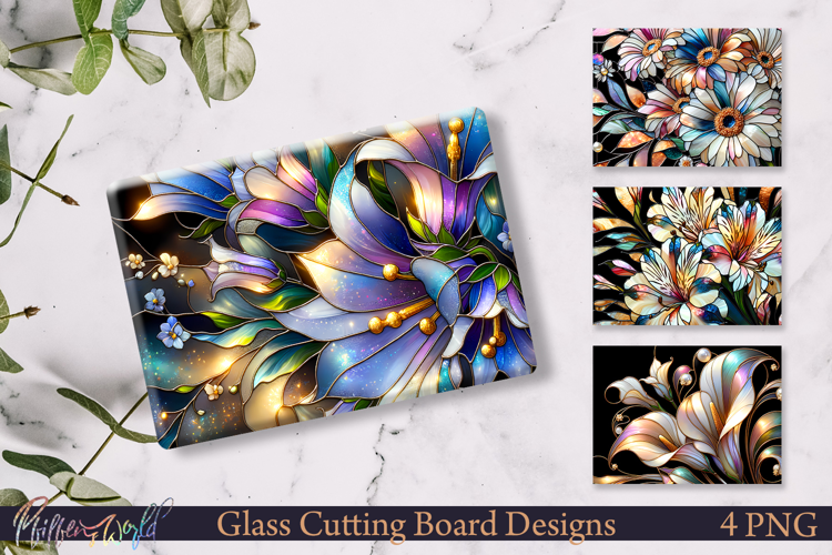 Bring a luxe botanical vibe to your kitchen projects with this Stained Glass Floral Glass Cutting Board Design Set. Featuring jewel-toned blossoms in purples, pinks, and soft blues with elegant gold-line details, these designs look like handcrafted stained glass—perfect for creating standout kitchen décor and giftable products.